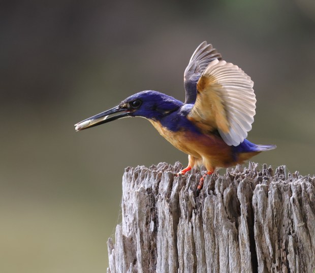 An azure kingfisher finally landed in a nice spot with his snack. This is one of the many captures that I took at a local park after year's searching.