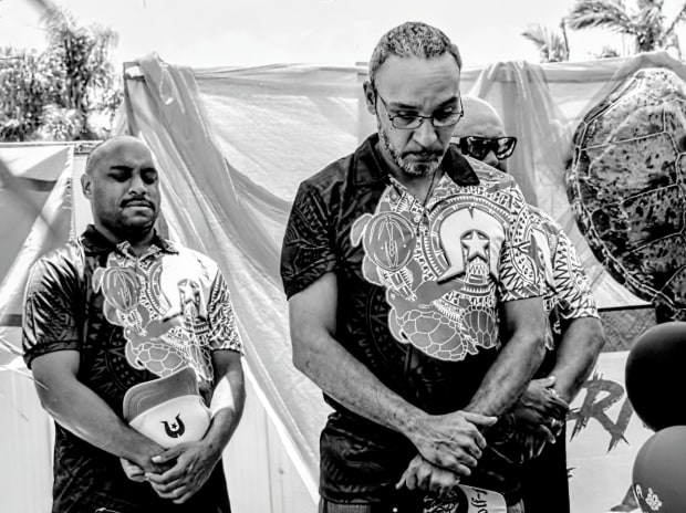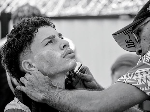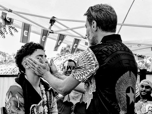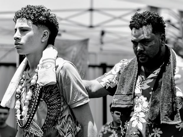 A family comes together and a father guides his son to the Torres Strait Islander shaving ceremony marking a boy’s transition to manhood. His Awadhes (uncles) perform the first shave of his beard symbolising his new status as an adult and passing on cultural knowledge declaring the young man’s new role and responsibilities.