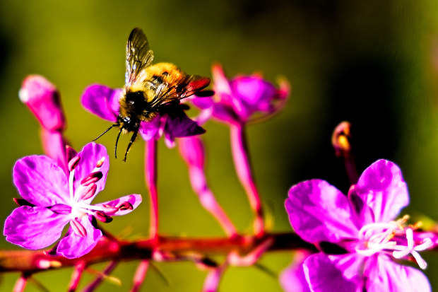 Rather than battle the crowds at a popular tourist lookout in Canada's Rockies, this tranquil moment was captured to highlight the simple blessings our world has to offer. Such as a humble bee foraging for food - regardless of the chaos surrounding it.