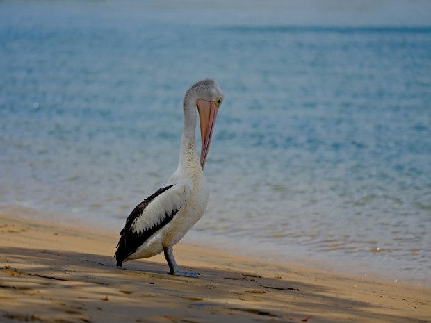 Pelican blown in by storm at 1770 . Recovering with Sun , Sand and Sea