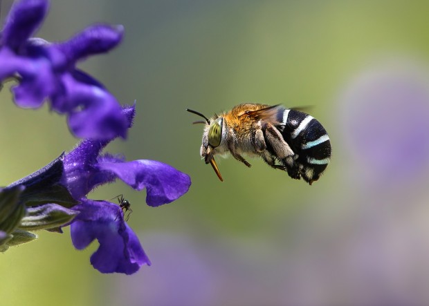 Blue-banded Bees are one of the most attractive native bees. They are solitary and females make nests by burrowing into soil or mud. The males have 5 coloured strips and the females four. The colour of different species iridescent stripes range between white, blue, turquoise or green. These bees are extremely fast, much faster than regular bees so are difficult to photograph, especially in flight, they often only land on a flower for a second or so. These bees "buzz polinate" by vibrating their flight muscles at high frequencies while gripping a flower, causing pollen to shoot out.