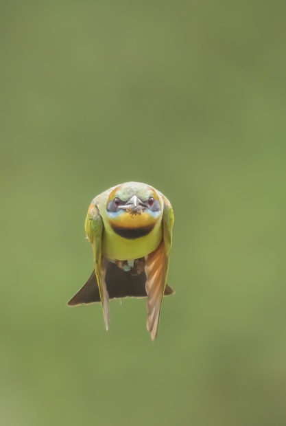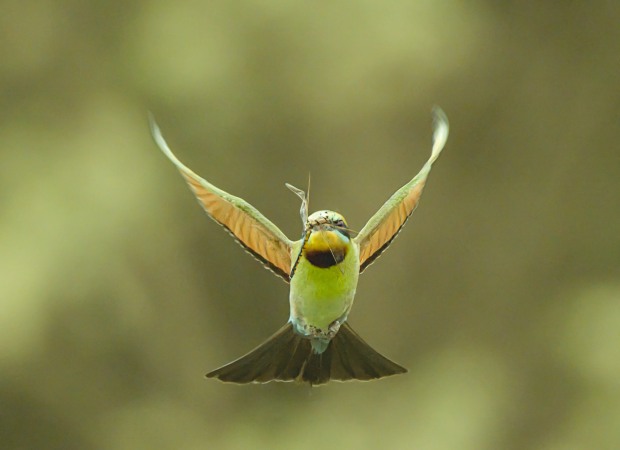 A flying Rainbow Bee-eater with an insect in its beak looks more striking than one without. But the chances of capturing the bird flying towards the photographer can be rare. I have been photographing Rainbow Bee-eaters in central and northern Victoria during their breeding season for a few years, but only in January 2024 that I was lucky to have witnessed such a scene: EACH of the rainbow bee-eaters clutched its captured prey in its slightly curved black beak, held firmly, and continued its smooth, buoyant flight- in the direction of me.