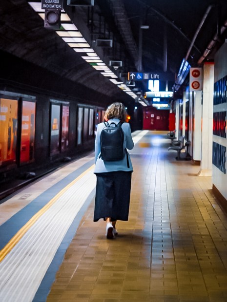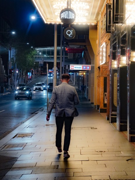 In the quiet hours of the city, people move through spaces between destinations. A shift beginning, a platform crossed, a walk beneath theatre lights. Small human journeys unfolding in the stillness of the night.