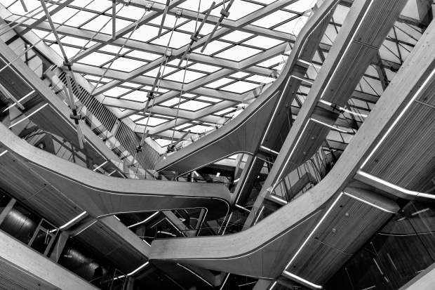Bjergsted Financial Park located in Stavanger, Norway is one of the largest timber buildings in Europe. As a visitor, unfortunately I could only access the ground floor however it was enough to view and admire its unique centerpiece of the glass-covered staircase and stylish angular design and rounded timber surfaces in the interior.