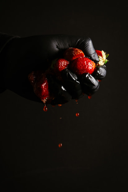 A study of pressure and release. Fruit is held and compressed by a black-gloved hand, reducing the image to colour, form and force. The absence of context heightens tension, turning an everyday gesture into something charged, suggesting control, consumption and the thin line between care and destruction.