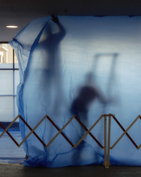 Two plasterers work behind a blue plastic sheet, repairing the roof of a train station.