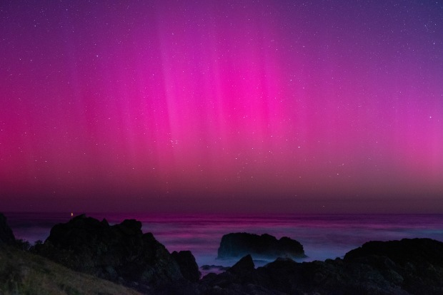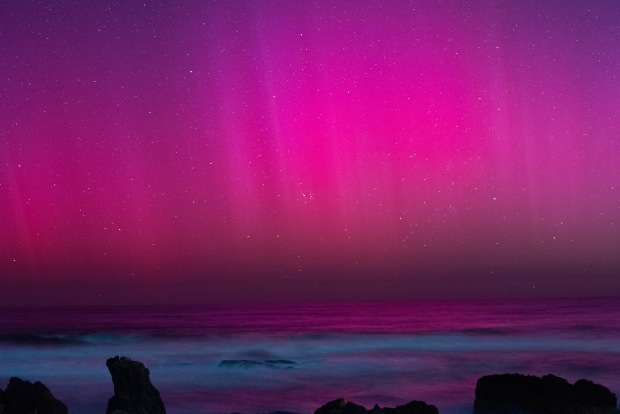 The Southern Lights glow brightly above the sea, blending neon pinks and cool blues into a mystical palette. This image captures the rare harmony between moving water and shifting light, unveiling the ocean as a magical reflection of the night sky.