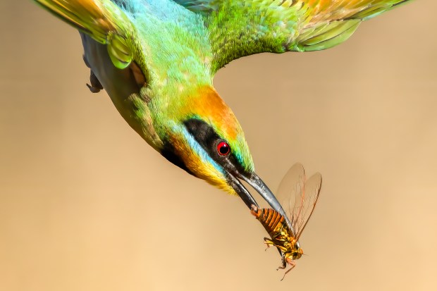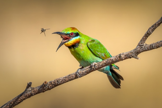 The Rainbow Bee-Eaters migrate from the northern states of Australia to the southern states in summer to dig their metre deep burrows in the sand and bring up their chicks. The adults catch bees, dragon flies, cicadas moths and butterflies in mid flight and feed the chicks in the burrow. The chicks grow in total darkness in the burrow and when they are ready to fledge, they will move to the entrance of the burrow and see daylight for the first time. Within about 30 seconds they will step out of the burrow and fly for the first time. The fledglings have a very strong instinct for hunting at the time they leave the burrow. After a few weeks, the flock has gain its strength and will return to the northern states for winter.
