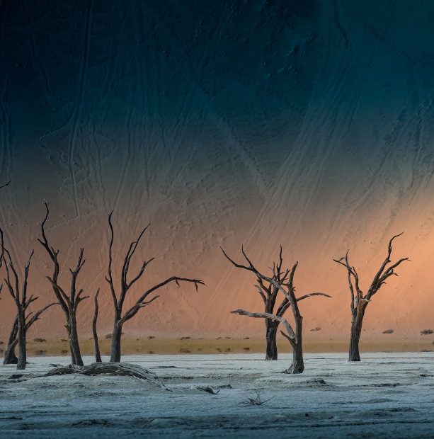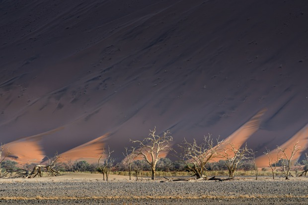 The Namibian Desert provides a feast of changing colour from its contrasting red dunes, bleached white salt pans, blue skies and dead trees. Different times of day produce a kaleidoscope of changing hues. The early morning drive, through the Sossusvlei, as the sun rose produced a vista of shadow and light and a descending colour palate. High dunes shaded purple, smaller foredunes lit by the rising light showing their red glow and the golden hue of the trees. As the sun rose higher in the sky, I climbed the red sand dunes to descend into the white dry Deadvlei Pan. The dry heat and beating sun produced a startling imprint on the eyes. The red dunes framed a harsh white floor, dotted with 900-year-old dead trees. Those who trek into the Deadvlei Pan can immediately feel the solitude and desolation brought on by ancient dead trees and a harsh climate. The lone traveller, walking the dusty white pan, surrounded by red sand and dead trees personified the feeling of solitude in a vast landscape. The changing light in the Deadvlei Pan, and the sunlight on the surrounding dunes, formed a perfect backdrop to highlight the dead trees and the contours of the sand dunes rising above them. The Namib Desert environment, perfected by eons, for the photographer to capture light, shade, and the essence of time.
