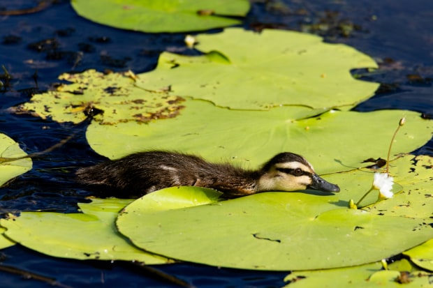 A little pacific black duckling stretching out over a lily pad to catch the aroma of a flower.