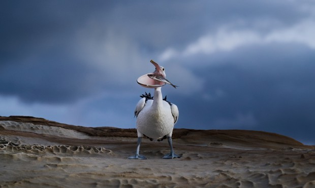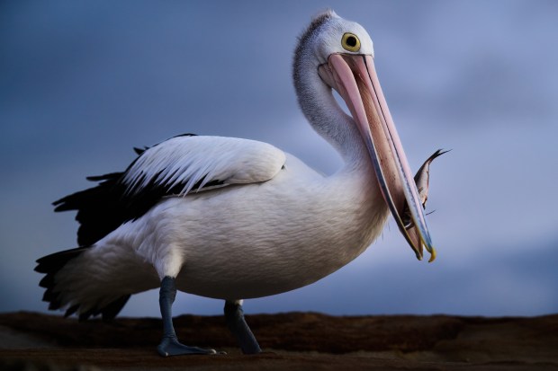 A pelican takes up position on a rock face in a storm to catch scraps thrown by fishermen, sometimes they were successful other times they were not. The dramatic sky and light hitting the rocks added to the drama of the scene