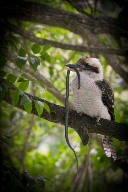 I captured a lovely Kookaburra holding its lunch in a tree in my backyard