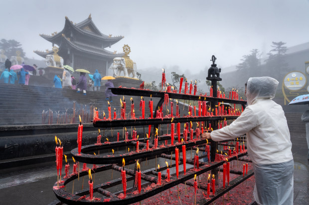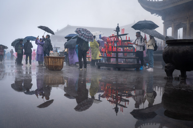 Rain drapes Mount Emei in mist, blurring the mountains into a hushed, sacred landscape. Despite the steady downpour, worshippers continue their pilgrimage, incense smoke mingling with rain-soaked air. Their quiet devotion brings warmth and movement to the gray surroundings, revealing a faith that endures regardless of weather.