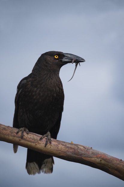 A Black Currawong perched against a moody early evening sky. Its prey, and unfortunate Skink clasped in its beak.