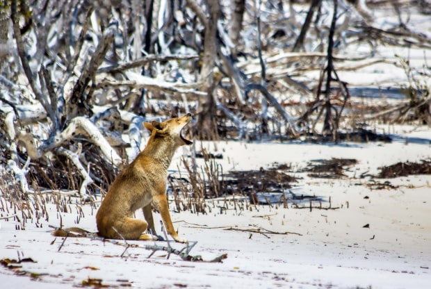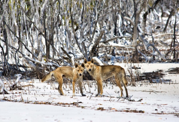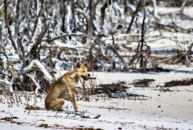 Taken on Fraser Island Queensland Been waiting all day and finally 2 Dingo's came out to see what was going on? Out on the Beach. Obviously not much going on as he his yawning lol seems Not to have a worry in the world. white sands of Fraser flowed over the area, with the backdrop of white and black, dried dead tree's scattered along the beach, giving the image a mysterious feel, and looking like snow had fallen amongst the trees Use my 90D canon with 70-300 canon lens.