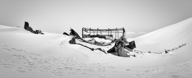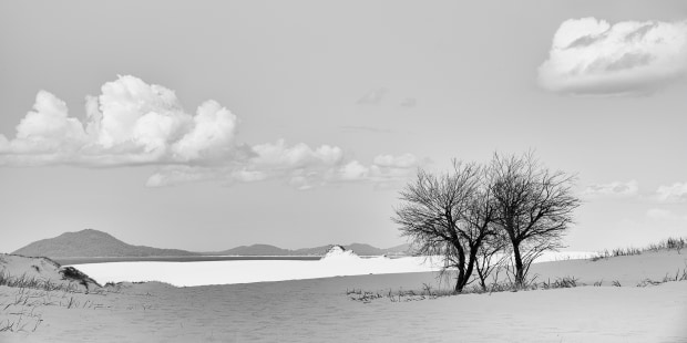 The images depict diversity of survival in this harsh environment. A once used corrugated iron shack, part of which was made from the canopy of a truck became exposed during a wild weather event. An almost regular pattern of ripples transitioning to silky smooth textures and topped with Spinifex grasses create an intriguing landscape. And the starkness of trees is enhanced by contrasting bright sunlit sand and shadows cast by passing clouds.