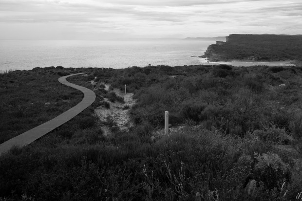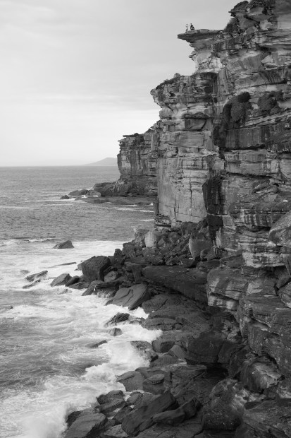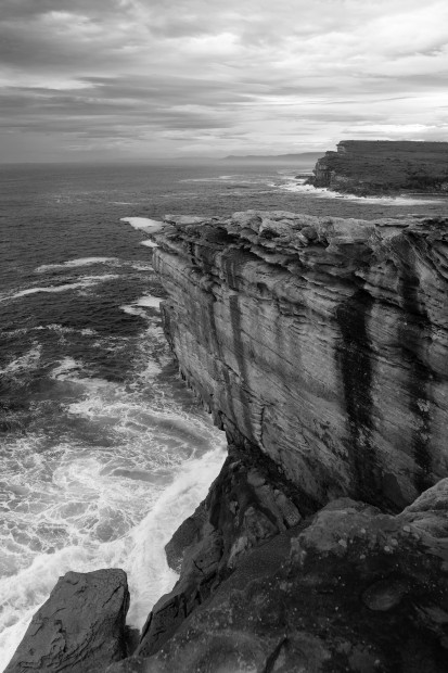 A rugged coastline in NSW meets the open sea, where layered cliffs and shifting surf speak to time and erosion. The black-and-white treatment emphasizes texture, scale, and the quiet power of the landscape, at the boundary between solid ground and endless water.