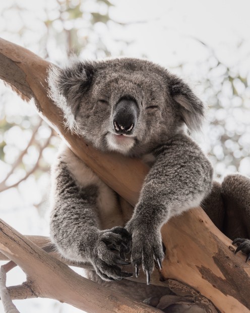 A Koala rests in a Eucalyptus tree in Portland, VIC, framed by the surrounding canopy.
