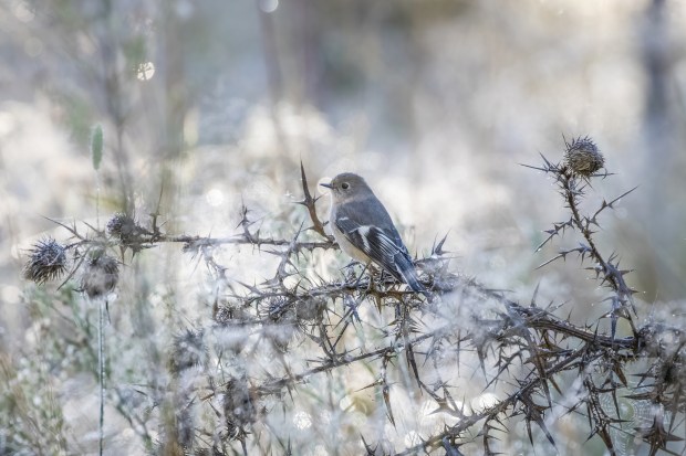 Female Flame Robin sits safely amongst the razor sharp thistles on a cold winter morning. I love the contrast of the delicate, beautiful bird amongst the harsh, barbed prickles. I also find the muted greens and greys and the dew drops on spiderwebs really pleasing to the eye.