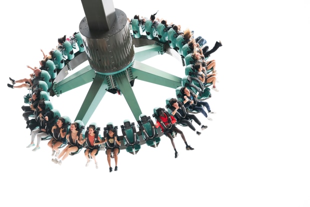 A moment captured with a range of emotions, frozen in time on a thrilling theme park ride.