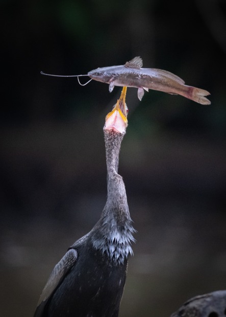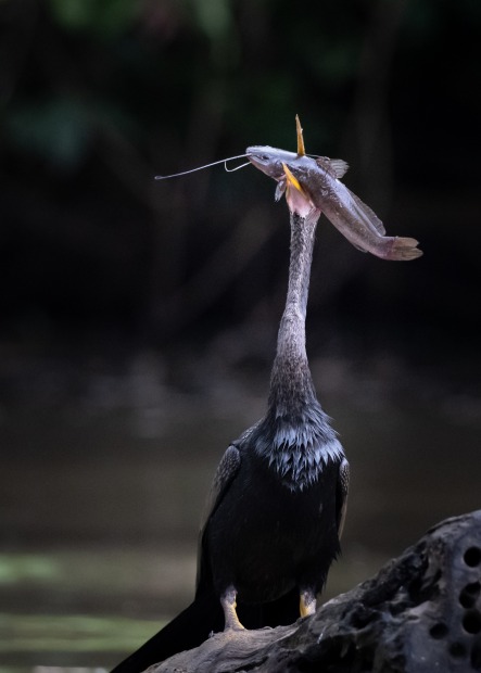 We were on a boat exploring a river in the Tortuguero National Park, Costa Rica when we came across a cormorant doing battle with a fish that it had just caught. The fish put up a mighty fight and managed to thrash its way free of the cormorant's beak on three occasions, only to be immediately recpatured each time. After what seemed an enormement amount of time, the cormorant finally succeeded in swallowing the fish. Everyone on the boat cheered and clapped the cormorant's success.