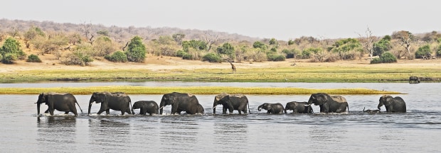 In Chobe NP, Botswana, I witnessed a procession of elephants crossing the Chobe River. The leader took time to carefully choose a relatively calm part, but in places it was quite deep. I marvelled at the care taken by the elders of the herd to ensure the safety of the little ones. The youngest was about 12 months old and was struggling with the conditions - at times becoming completely submerged. However, Mum knew what to do and gently guided the infant with her massive trunk.