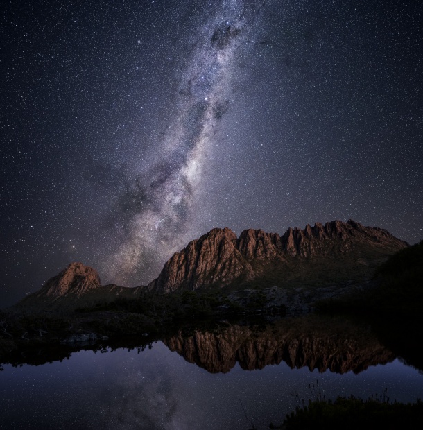 The galactic core rising over a prominent Tasmanian mountain during twilight hours
