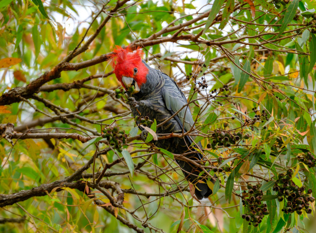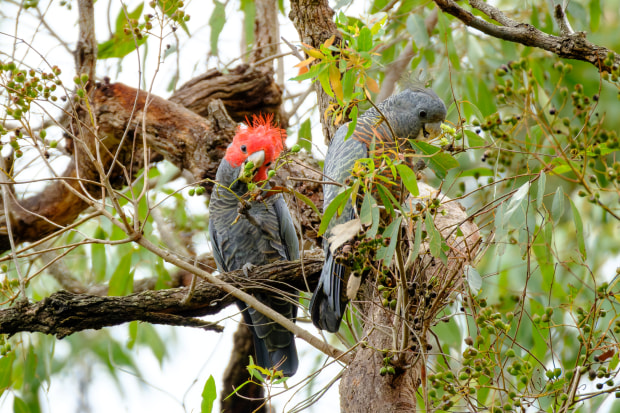 A Gang Gang cockatoo couple feeding in the bush on the South Coast of NSW. Endemic to South Eastern Australia they are classified as endangered in NSW particularly since the Black Summer 2019/2020 bushfires. Protection of their habitat has become critical to conservation of this iconic species.