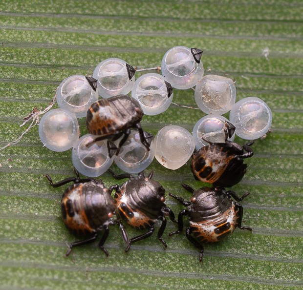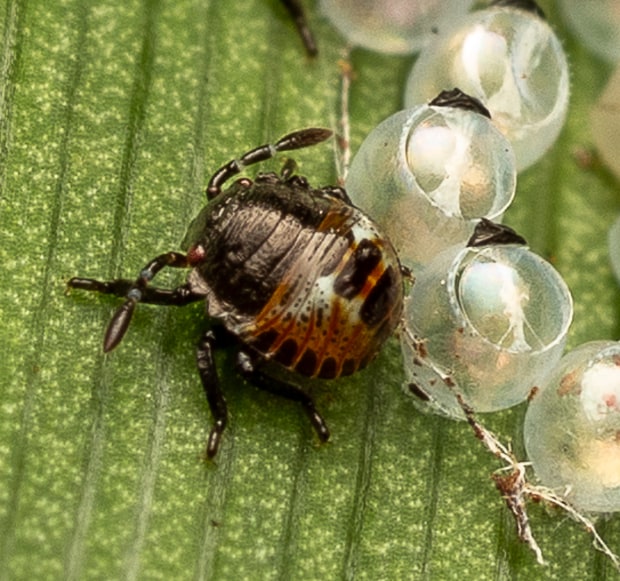 On a hot Sydney day in the Royal Botanic Gardens, there wasn't much insect activity. But then, I noticed a shadow on the underside of a leaf which, when I turned it over, turned out to be a cluster of pearlescent eggs that began to hatch these cute little stink bug nymphs before my eyes.
