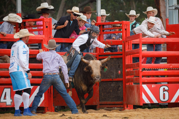 I love the energy of this bull rider's mates - all leaning in as the gate opens. They have his back, and one of them even has his hat.