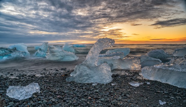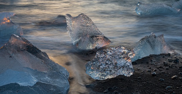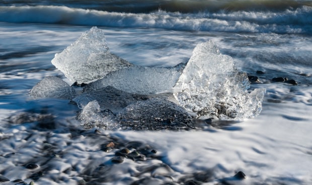 Icebergs from the Jökulsárlón Glacier Lagoon wash ashore, creating a magical contrast as they glitter like diamonds under the sun.