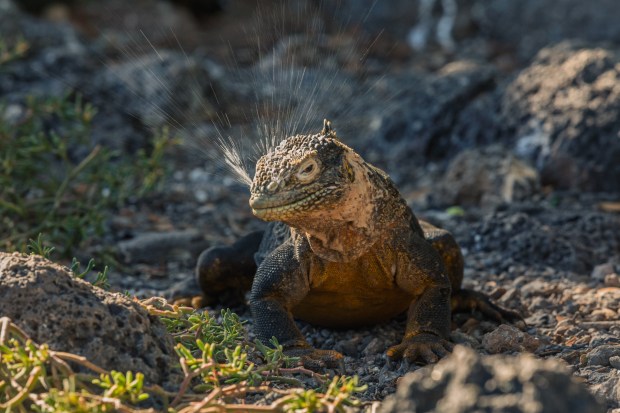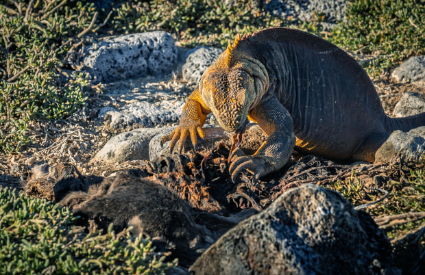 South Plaza Island in the Galápagos supports one of the densest populations of Galápagos giant land iguanas (Conolophus subcristatus). These reptiles are primarily herbivorous, feeding largely on Opuntia cactus pads, fruit, flowers and leaves across the island’s volcanic landscape. During a visit to South Plaza I observed an unexpected, somewhat rare, interaction along the rocky shoreline. A land iguana was scavenging the carcass of a dead Galápagos sea lion pup among the coastal rocks. Nearby, newborn sea lions were navigating the same terrain within minutes of birth, calling for their mother. Across the island where seasonal vegetation creates a striking colour variation, conservation efforts include protecting newly established cactus to support the long-term availability of a key food source, further reflecting the delicate balance between species in this small ecosystem. Together these photographs document overlapping moments of adaptation, vulnerability and opportunism within the fragile ecological dynamics of the Galápagos.