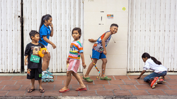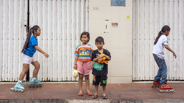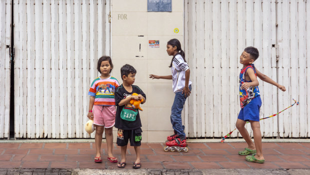 Local children can be seen playing and having fun on the side streets of Phnom Penh, Cambodia.