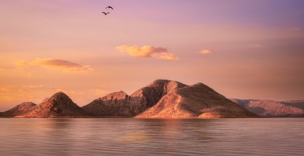 The barren mounds rising out of the waters of lake Argyle are bathed in the warm glow of light from the setting sun.