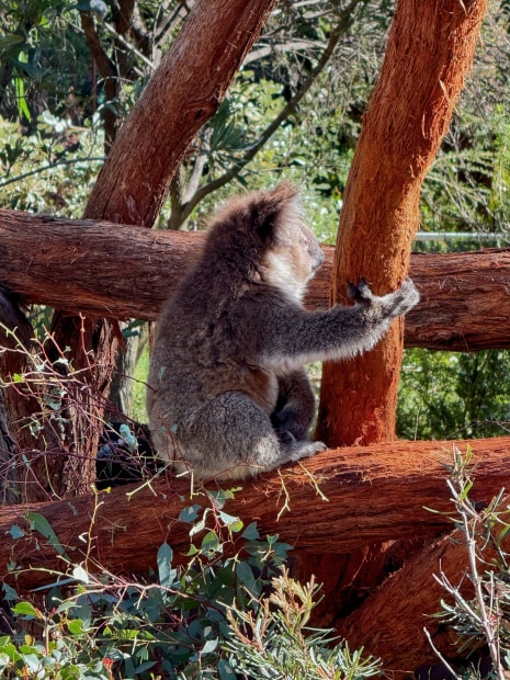 Koalas in the zoo doing their thing to escape boredom, while being watched by human spectators