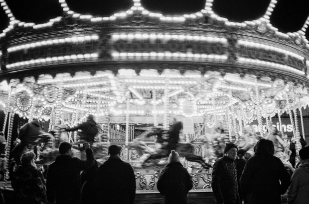 Loughborough Fair in the East Midlands of the UK has been operating for centuries. Originally chartered in 1221, it has over 800 years of history and brings together visitors and locals from all over the county. In November, the sun is setting early and two-thirds of a 24-hour day is under darkness. Warm clothing, constant drizzle and nighttime images become a photographers best friend. Under the cover of darkness, the people are less inhibited and share who they really are.