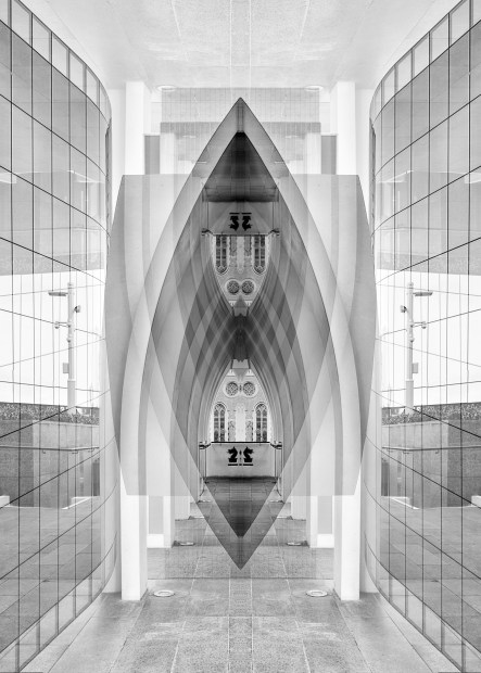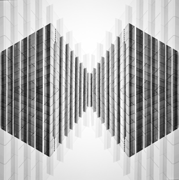 Using mirrored symmetry to transform buildings into a geometric, almost kaleidoscopic form. The shapes and lines create a sense of depth and balance, blending contemporary structures into another atmosphere.