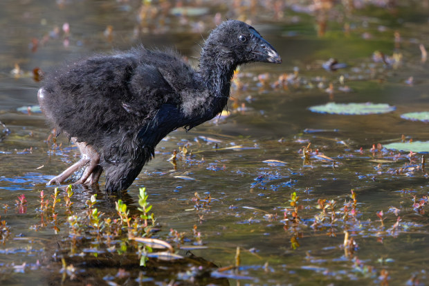 It is hard to believe that this young Australasian Swamphen will almost grow into its feet and look like its mum.