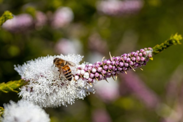 A close up shot of a bee on a chenille honey myrtle