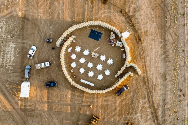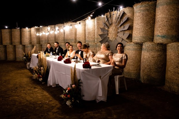 Set in remote Nth West QLD, Stella & Pierce's 'venue' was carved out of the paddock in the middle of the 50,000 acre property using a whole bunch of elbow grease, 220 70 kilo hay bales, hundreds of lights, an old windmill as the centre piece. Outback weddings, with the endless skies and extraordinary landscape, are incredible events. 100% of the work is done by the families, there are no wedding planners out there. And the party generally goes on for 3 days, they don't muck around in the bush.