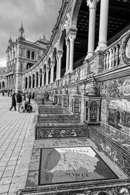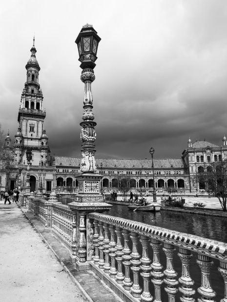 Spain is usually associated with being bright and sunny but the weather when we were in Seville last March was dark and stormy. Because of the gloom I decided to convert my images to Black and white to convey how it felt on the day and to enhance the dramatic clouds, and bring out the detail in the beautiful buildings without their natural colour. The area is very large so I decided to photograph small sections close up, rather than the usual overall scene.