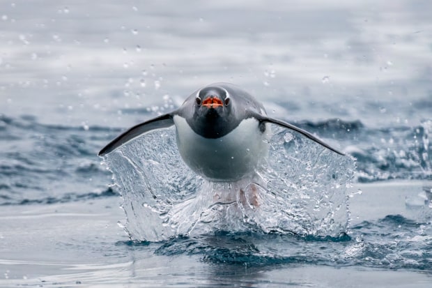 A gentoo penguin erupts from the ocean, water frozen by the camera as it porpoises toward the photographer.