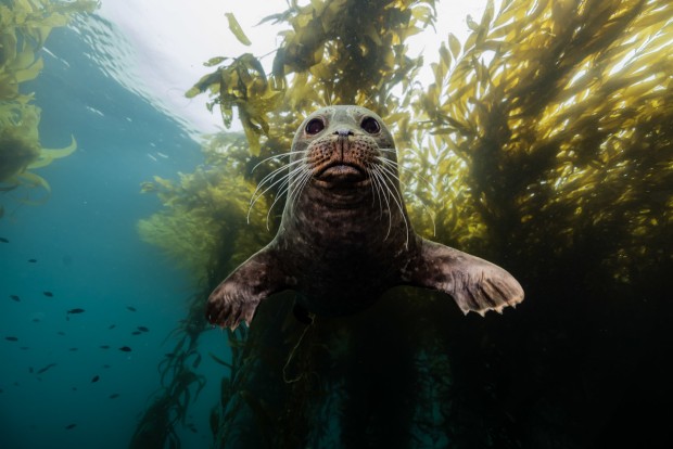 A puppy Harbour seal emerges from the kelp, looking at its reflection in the dome.