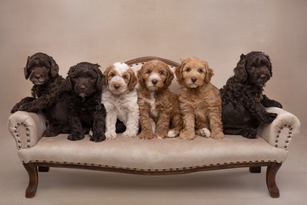 A litter of labradoodles posing nicely on a couch.