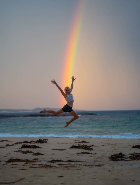Stormy afternoons on the beach at Bendelong. My daughter loves doing acrobats then a rainbow appeared. Its was just magical