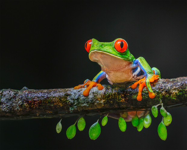 A Red-eyed Tree Frog, an Eyelash Viper and a Side-striped Palm Pit Viper captured in the forests of Costa Rica.