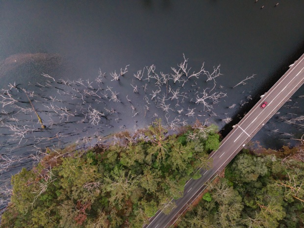 The car rushing on the road where looks like another planet in the static landscape.