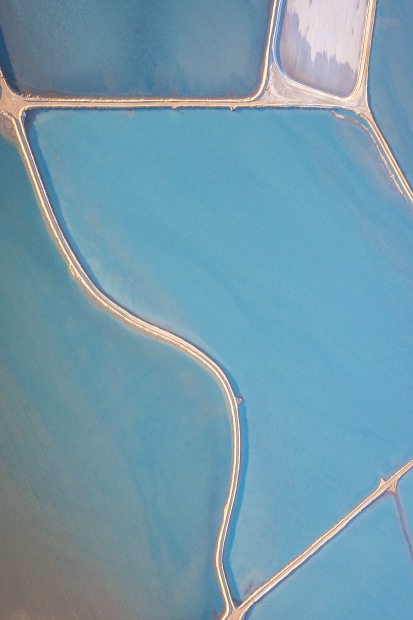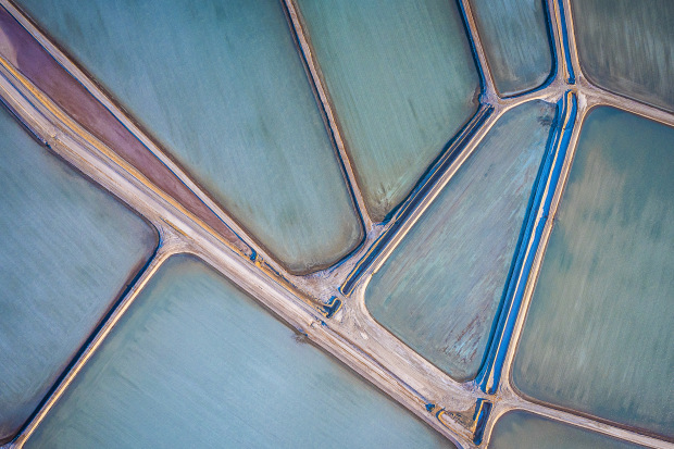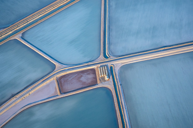 An aerial view of the salt ponds at Shark Bay, Western Australia, taken from a fixed wing doors-off flight in June 2021.
