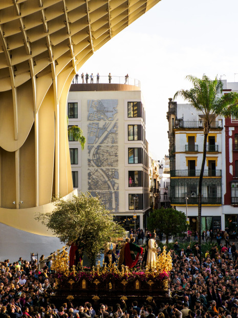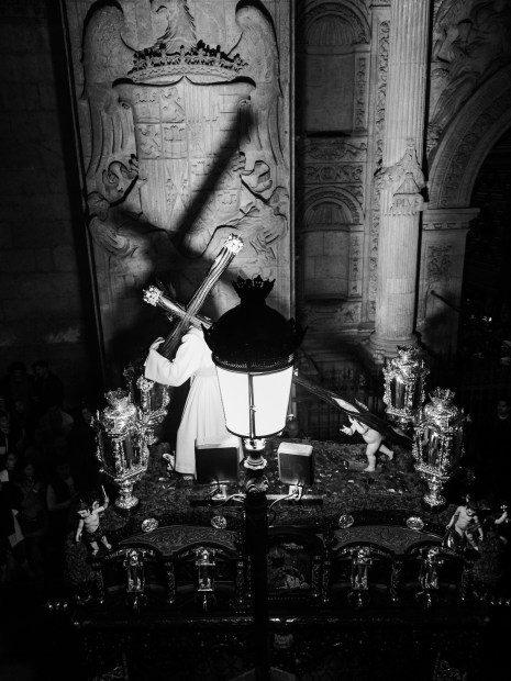 Semana Santa, Andalusia, Spain. The sights, sounds, solemnity and festivity of the numerous processions which occur during Holy Week. These images from Seville, Cordoba and Granada capture the pageantry, rituals and scale of the processions and the seriousness of all of the participants no matter their age. The ornate and heavy Pasos, carried by the Costaleros on long circular routes throughout the streets. Lead and accompanied by the Nazarenos wearing their capirote hoods, the elegant Donas, with peinita and mantilla, carrying rosaries and candle sticks, represent the mourners of Christ. As the band plays, Ninos, boys and girls, hand out religious cards and sweets to the spectators who line the streets. The crowds of all ages run ahead of the procession, in their best clothes to get the best vantage point, navigating road blocks, only adds to the excitement and carnival like atmosphere. The experience on the final evening was summed up by the graffiti which frames the crowd on the wall of the Granada Cathedrale quoting Karl Marx " La religion es ei opio del publeo" ( Religion is the Opiim of the People)