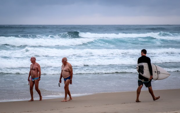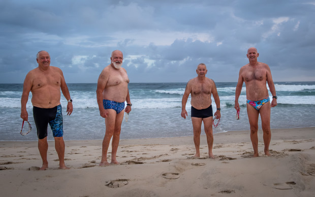 I usually ask people on the beach if they are happy to be photographed, especially if they are in bathers. These four were delighted, and posed for me. I noticed a surfer on the beach looking closely at two of the men.